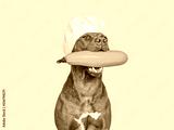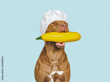 Lovable, pretty brown puppy holding squash. Closeup, indoors. Studio photo. Pet care. Concept of delicious and healthy food