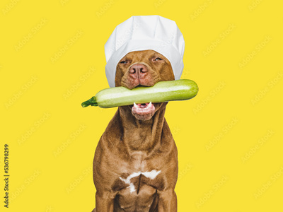 Lovable, pretty brown puppy holding squash. Closeup, indoors. Studio photo. Pet care. Concept of delicious and healthy food