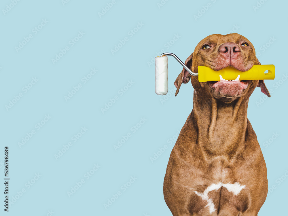 Lovable, pretty puppy and painting tools. Close-up, indoors. Studio photo. Concept of care, education, obedience training and raising pets
