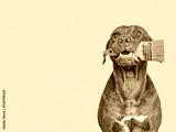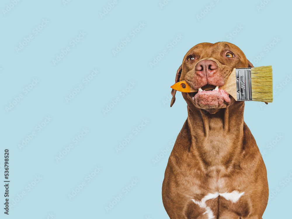 Lovable, pretty puppy and painting tools. Close-up, indoors. Studio photo. Concept of care, education, obedience training and raising pets