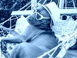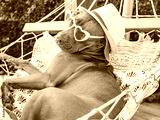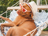Lovable, pretty puppy resting in a hammock against the backdrop of green trees and the summer sun. Close-up, outdoors. Day light. Concept of care, education, obedience training and raising pets