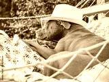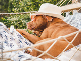 Lovable, pretty puppy resting in a hammock against the backdrop of green trees and the summer sun. Close-up, outdoors. Day light. Concept of care, education, obedience training and raising pets