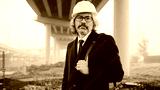 portrait of building project supervisor standing in construction site wearing helmet and formal suit and looking at camera