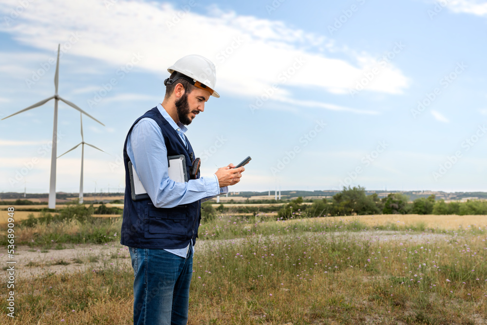Male engineer wearing helmet and vest checking data on phone while inspecting wind turbine farm. Copy space.