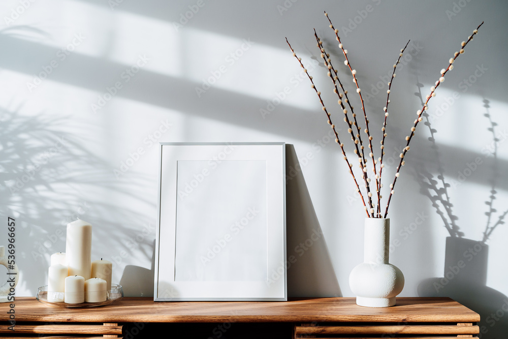 Modern minimalist style interior with white poster mockup, candles and blooming branches of the pussy willow in vase on wooden console under sunlight and shadows on a white gray wall. Selective focus