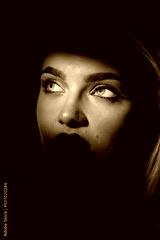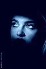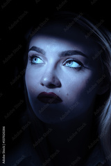 Fashion concept. Beautiful blonde woman portrait partly face covered with shadow. Seductive eyes illuminated with light. Moonlight or neon light illumination effect. Toned image in blue color