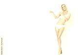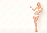 Cheerful woman in underwear on white wall.
