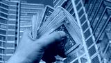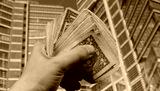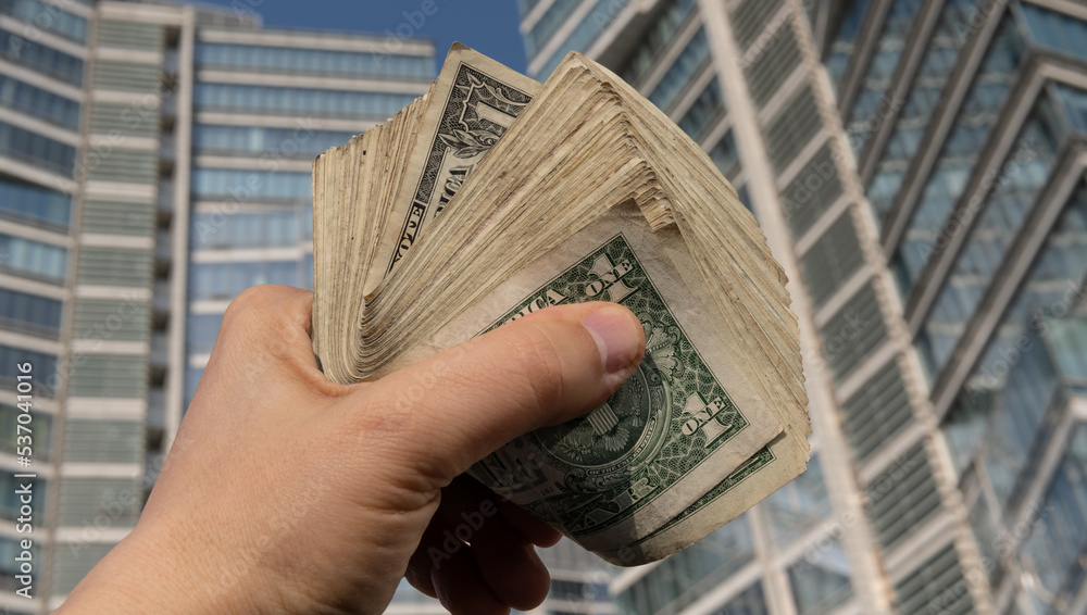 A stack of one dollar bills in a man's hand against the backdrop of a skyscraper