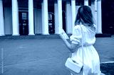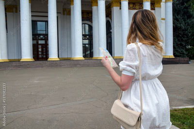 Back view of tourist girl standing with map and looking at the city attraction. Travel and active lifestyle concept