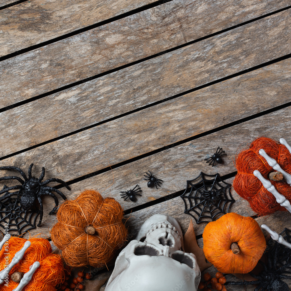 Halloween greeting card with pumpkin, skulls, bony hands and leaves