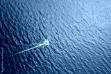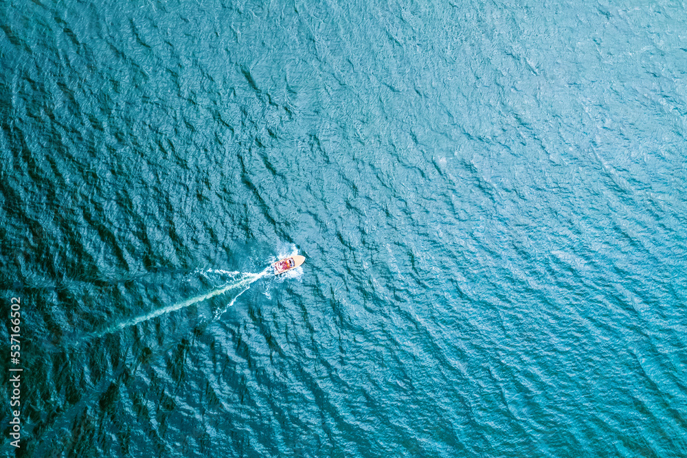 olyka or a ship sailing on the surface of the blue boundless ocean, aerial view from above