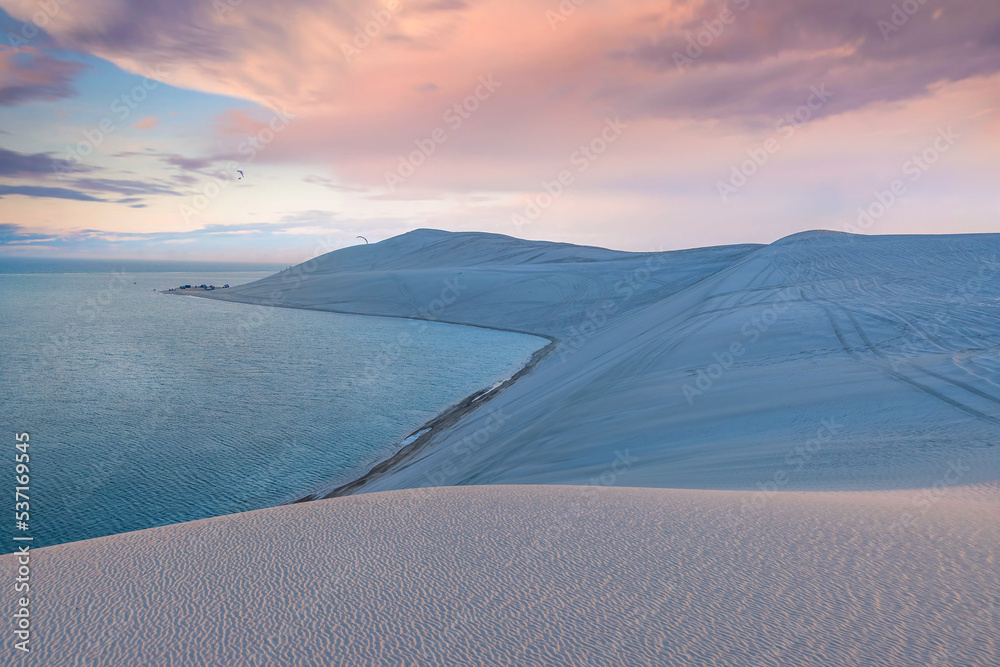 Desert at sunrise, morning glow over dunes inland sea of the Sea line Desert just out of Doha, Qatar.