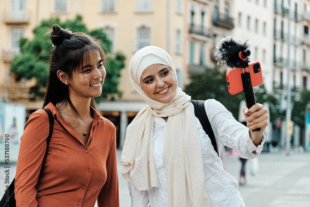 Multi-ethnic female friends smiling while streaming or recording with a mobile phone outdoors on the street.