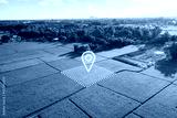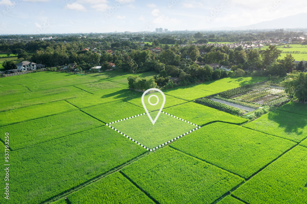 Land plot in aerial view. Identify registration symbol of vacant area for map. That property, real estate for business of home, house or residential i.e. sale, rent, buy, purchase or investment.