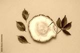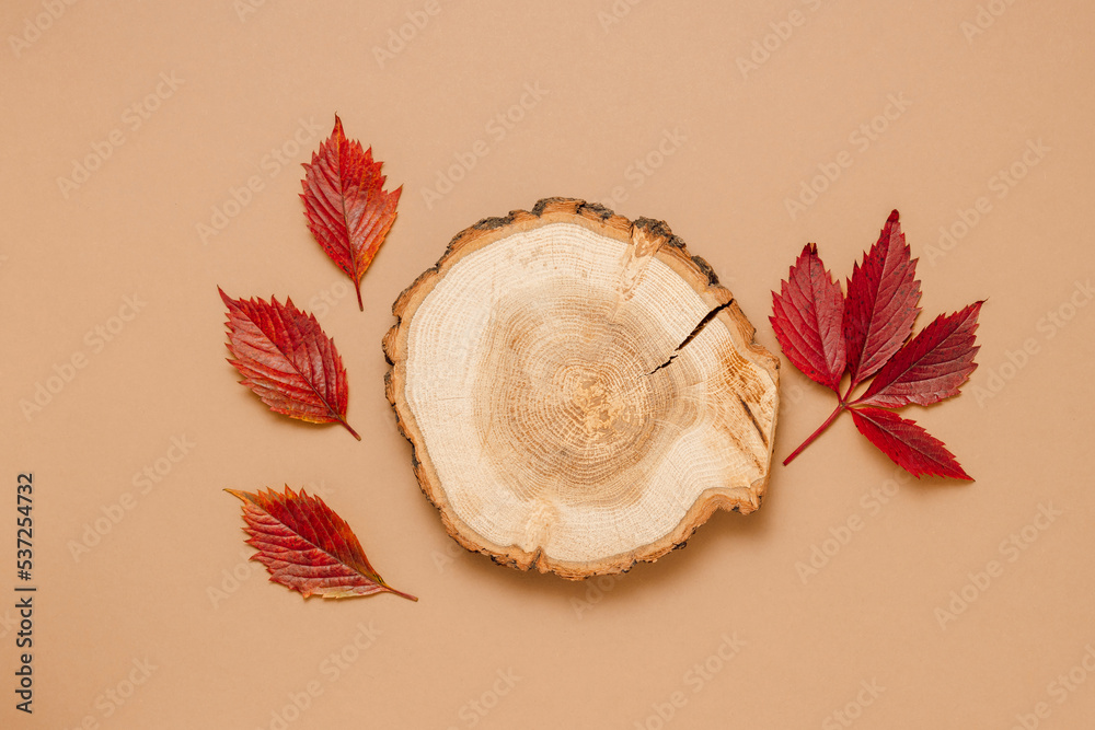 Wooden aesthetic podium with autumn red leaves top view, brown background