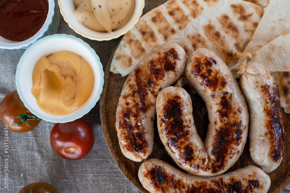 Grilled sausages with sauce and vegetables. Summer rest concept