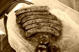 Grilled sausages with sauce and vegetables. Summer rest concept