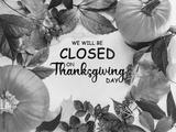 We will be closed for the Holidays. Beautiful Thanksgiving sign. Bright pumpkins, tree leaves, red berries and colorful flowers lying on an empty table. Close-up, top view. Holiday concept