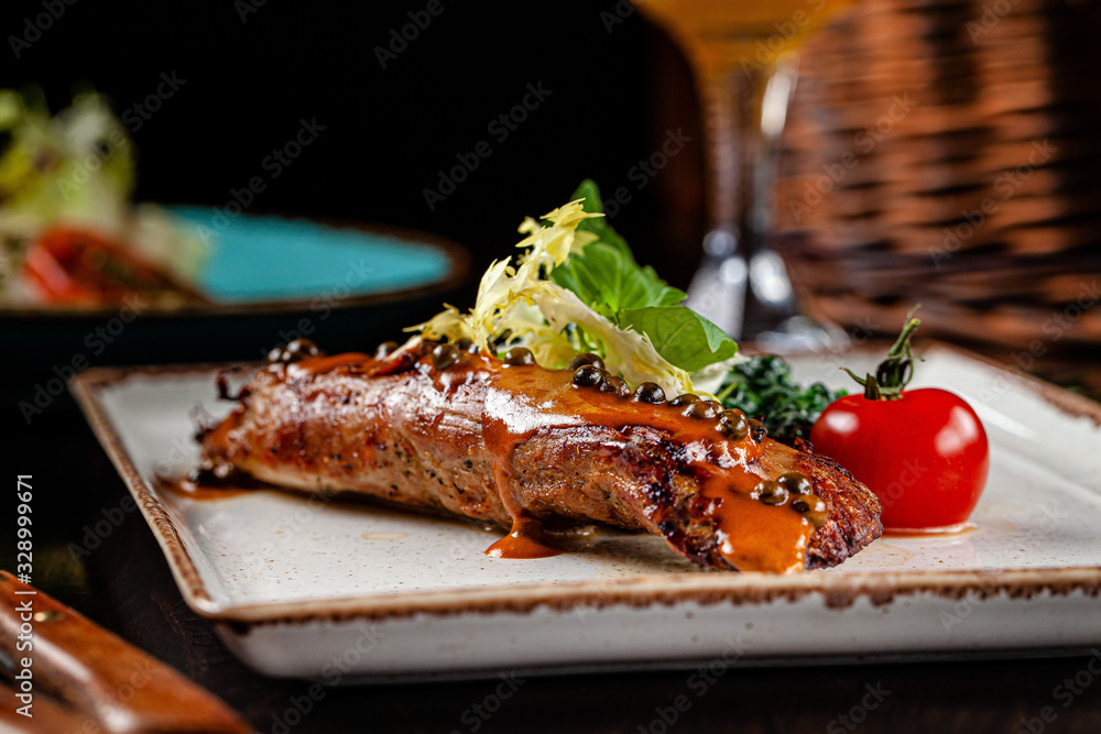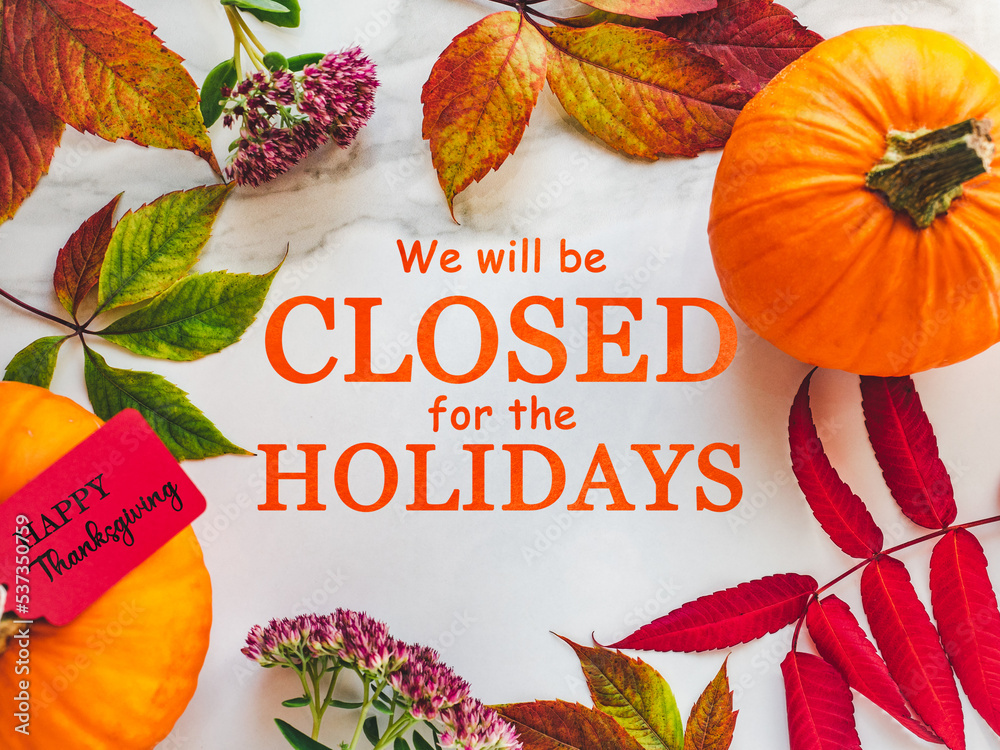 We will be closed for the Holidays. Beautiful Thanksgiving sign. Bright pumpkins, tree leaves, red berries and colorful flowers lying on an empty table. Close-up, top view. Holiday concept