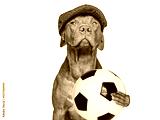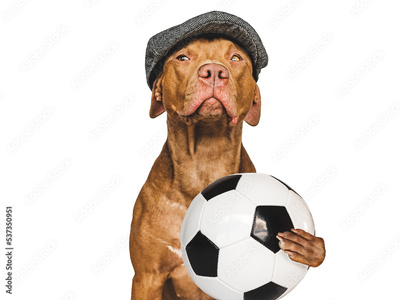 Charming, lovable puppy and soccer ball. Preparing for the World Cup. Close-up, indoors. Studio photo. Concept of care, education, obedience training and raising pet