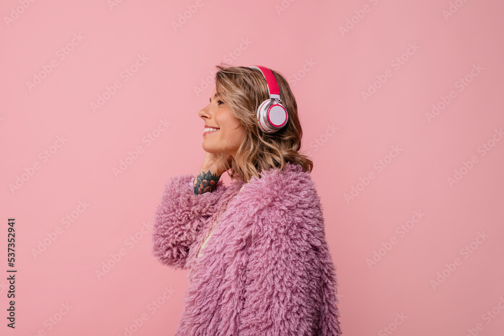 Profile photo of pretty young caucasian girl using wireless headphones on pink background. Blonde woman with wavy hair wears fur coat. Concept audio