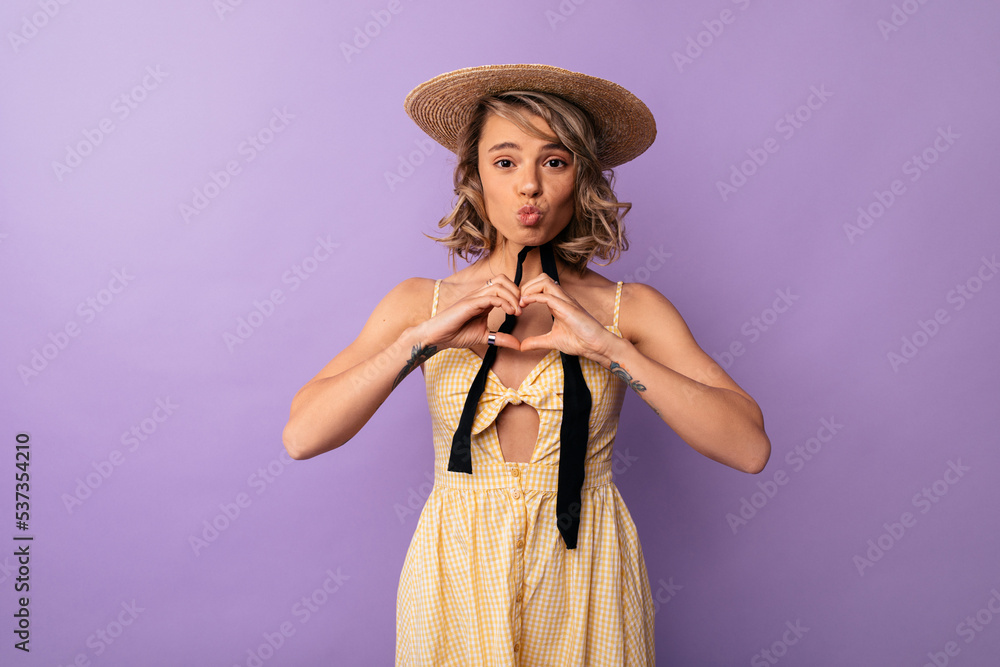 Nice young caucasian girl shows heart gesture, presses her lips looking at camera on purple background. Brunette with wavy hair wears dress and hat. Lifestyle concept