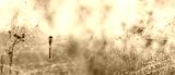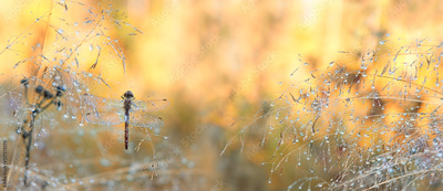 Dragonfly in drops of morning dew on fluffy field grass, blurred abstract natural background, close-up. artistic image of harmony nature. cold weather, summer or autumn season. Wildlife, insect.