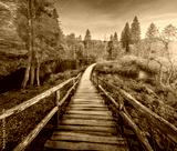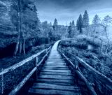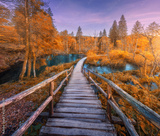 Wooden path in orange forest in Plitvice Lakes, Croatia at sunset in autumn. Colorful landscape with stairs in park, trees, red foliage, water lilies, river, pink sky in fall. Trail in woods. Nature