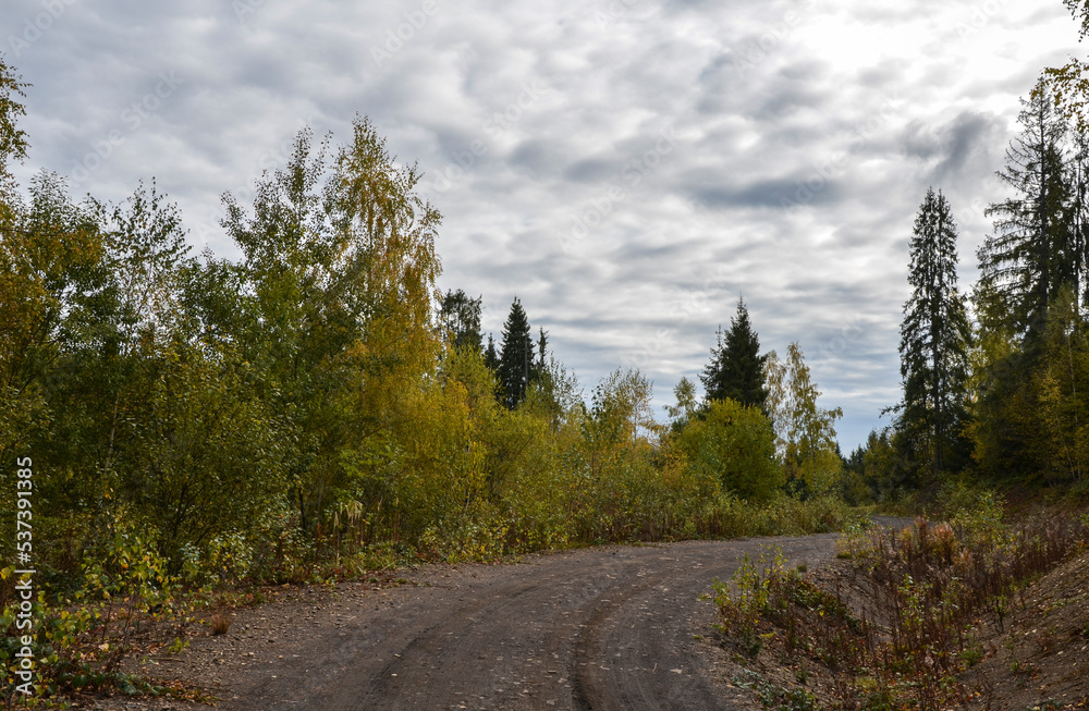 Winding mountain hiking path through the autumn forest. Trail in Carpathian Mountains, Ukraine