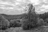 Autumn mountain forest with leafy and fir green, yellow trees at hills. Carpathian Mountains, Ukraine