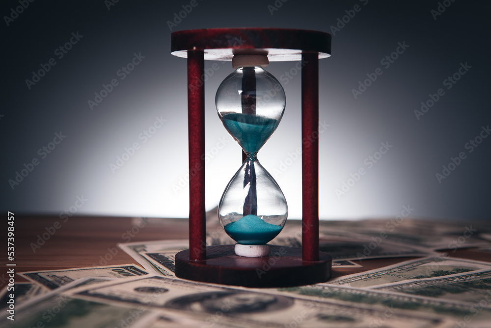 time is money concept, US dollar banknotes and hourglass as a business banner