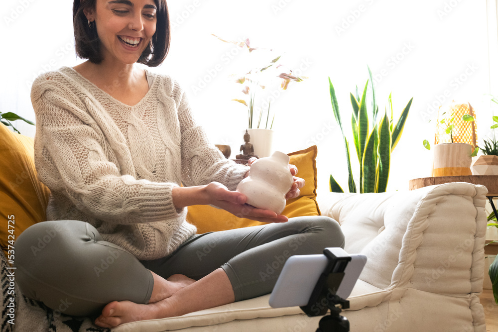 Happy young caucasian woman DIY influencer recording video with smartphone showing handmade ceramic vase. Copy space.