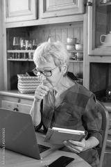 Senior mature woman using laptop at home, watching online webinar