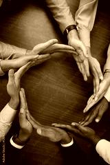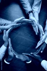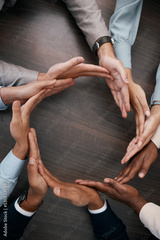 Hands, teamwork and synergy with business people in a circle or huddle as a team on a wooden table in the office. Collaboration, motivation and goal with an employee group working together on success