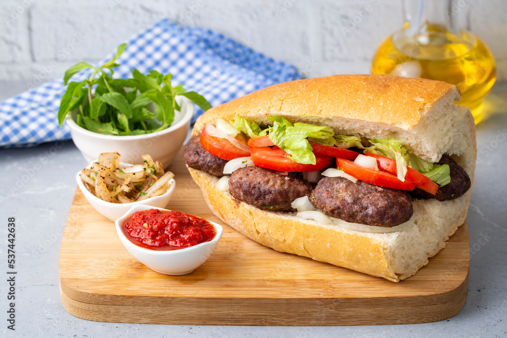 Delicious Turkish Meatballs Sandwich, Kofte Ekmek. Turkish name; kofte ekmek or ekmek arasi kofte