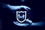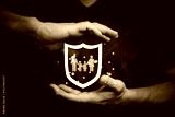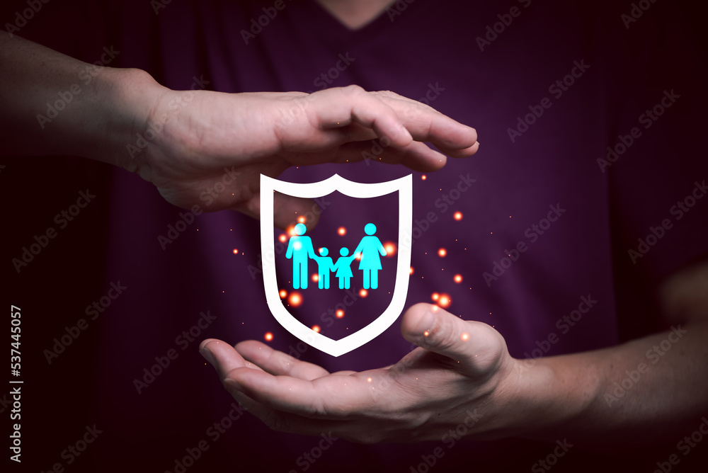 Businessman with protective gesture with family, life, health and house insurance icons, Family life insurance and policy concepts.