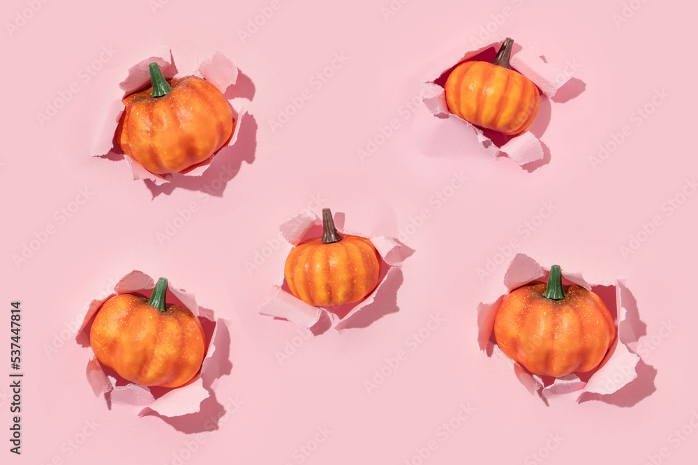 Autumn halloween creative pattern made with pumpkins pop up from pastel baby pink background. Vintage retro aesthetic 80s or 90s fashion fruit concept. Minimal autumn season food idea.