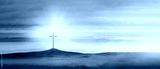 Silhouette of christian cross, lights, bokeh on black background. Copy space. Faith symbol. Church worship, salvation concept. Faith symbol in Jesus Christ. Holy cross for Easter day. Christianity