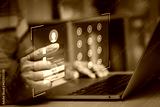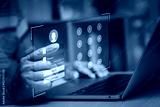 man using laptop computer and sign up or log in username password virtual touch screen.