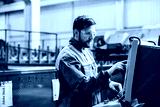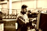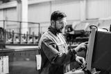 A heavy industry worker controls the machine and looks at the display while standing in the facility.