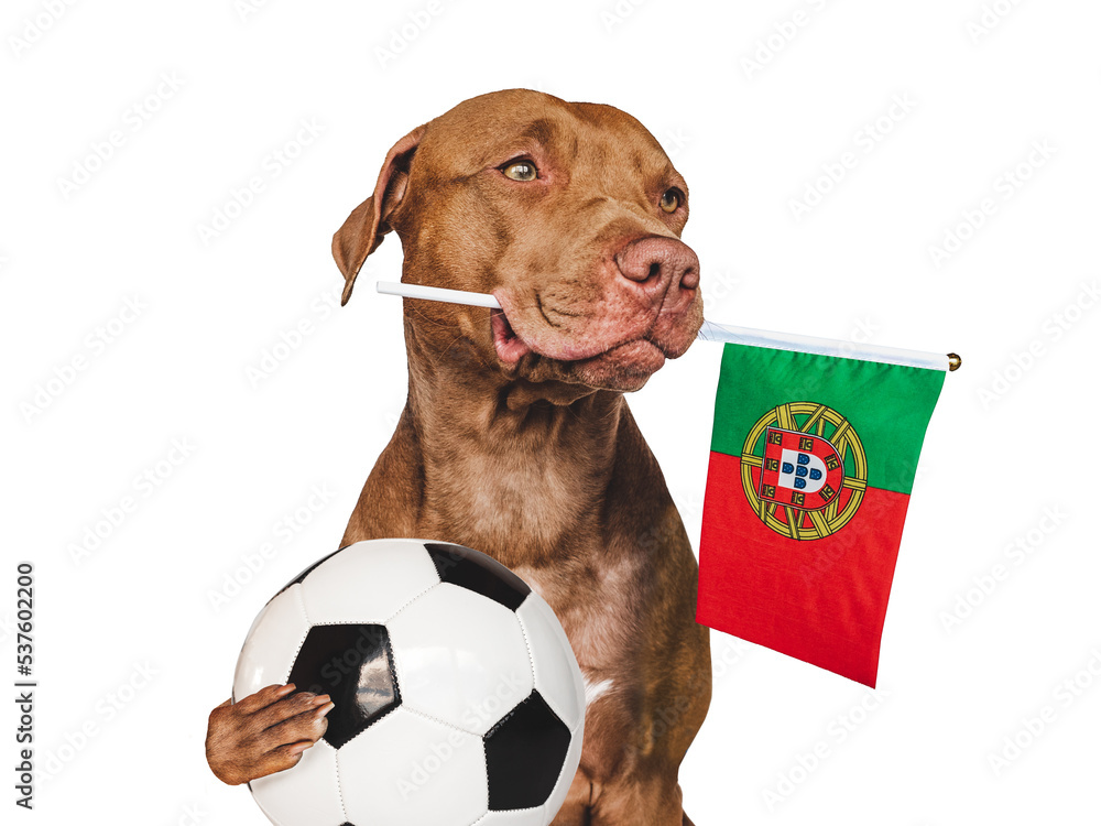 Charming, adorable puppy, holding national flag of Portugal and soccer ball. Preparations for the World Cup. Closeup, indoors. Studio photo. Concept of care, education, obedience training, raising pet