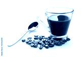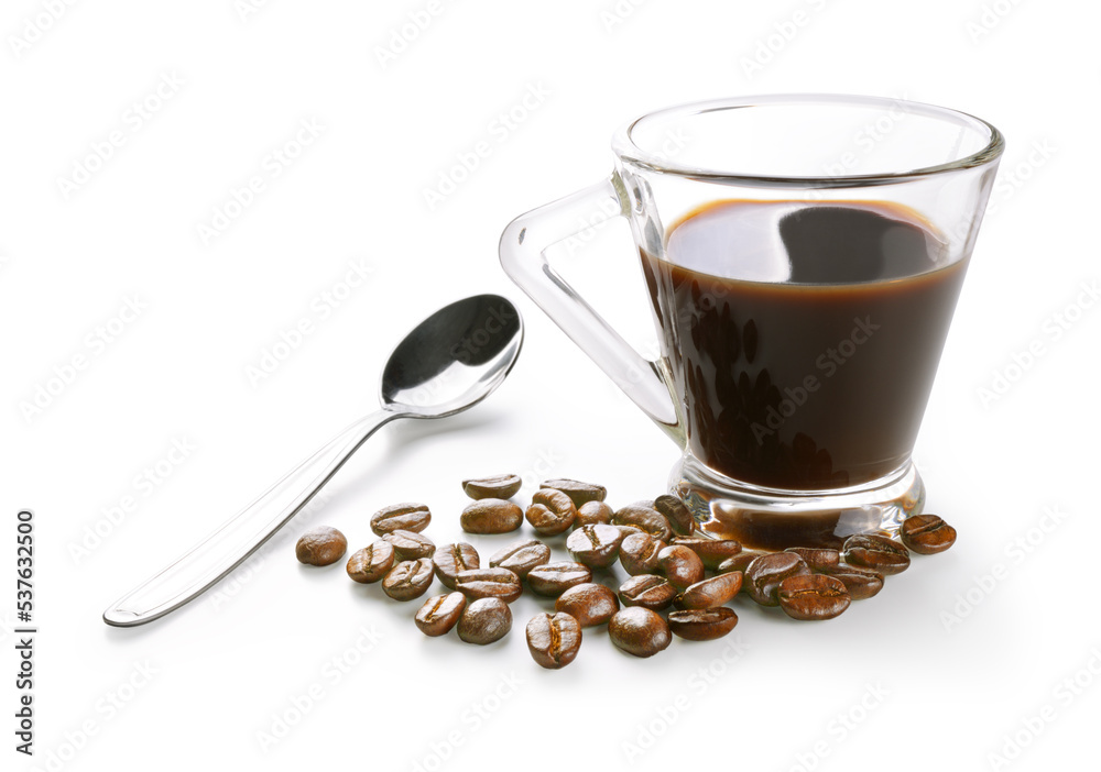 Glass cup of espresso coffee with coffee beans and teaspoon isolated on white background.