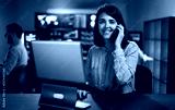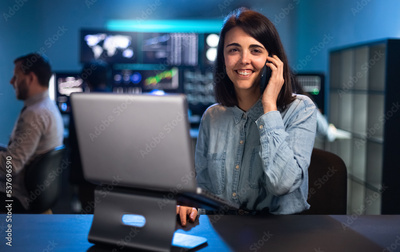 Female stock market trader working in office using laptop and talking on the phone with client looking at camera.