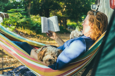 Adult woman relaxing and reading book while lying in hammock with cockapoo puppy near motorhome on camping trip. Female living on camper car with animals and travel the world. Caravan car Vacation