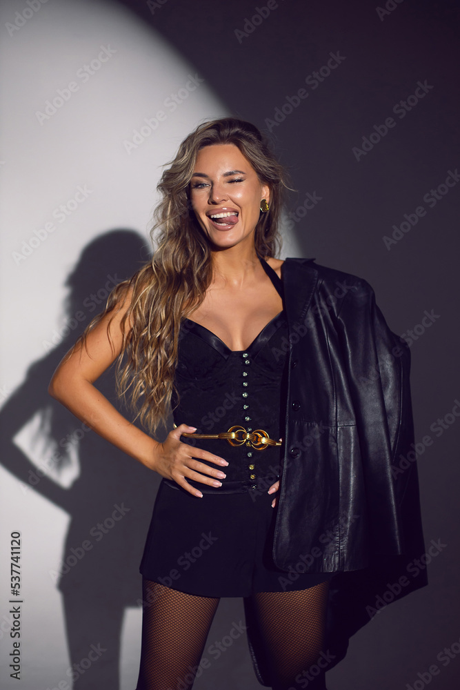portrait of a sexy woman in a black corset, shorts and boots stands in the studio on a white cyclorama with a light spot.