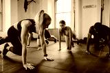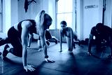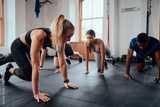 Group of focused multiracial young adults with trainer doing mountain climbers at the gym