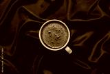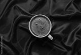 Cup of coffee on brown smooth silk fabric, top view, aesthetic minimal concept