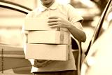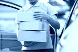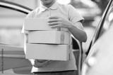 A delivery man is delivering cardboard boxes to customers at the door of a private car. young man delivery man in casual clothes Parcel moving service