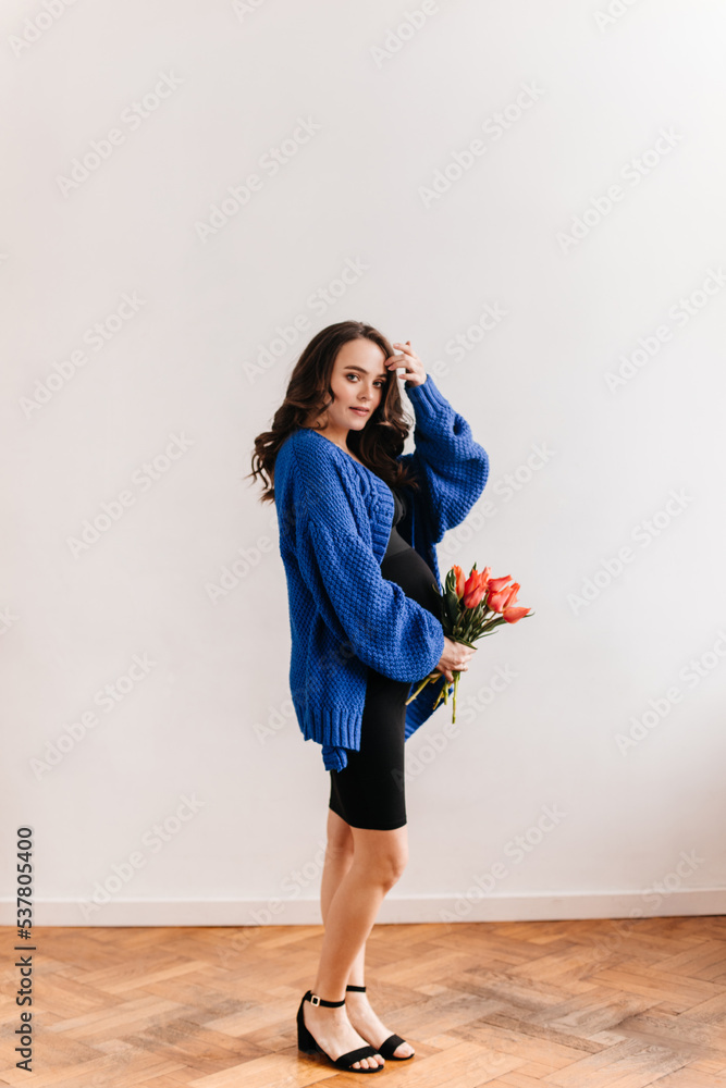 Charming pregnant woman in blue cardigan holds tulips bouquet. Happy young lady in black dress poses with flowers on isolated