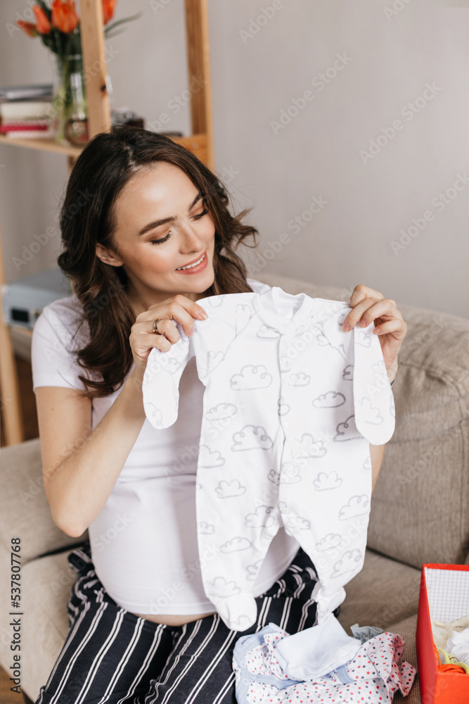 Pregnant woman with beautiful makeup sincerely smiles and holds baby white jumpsuit with clouds l. Portrait of pregnant lady in good mood poses in light living room